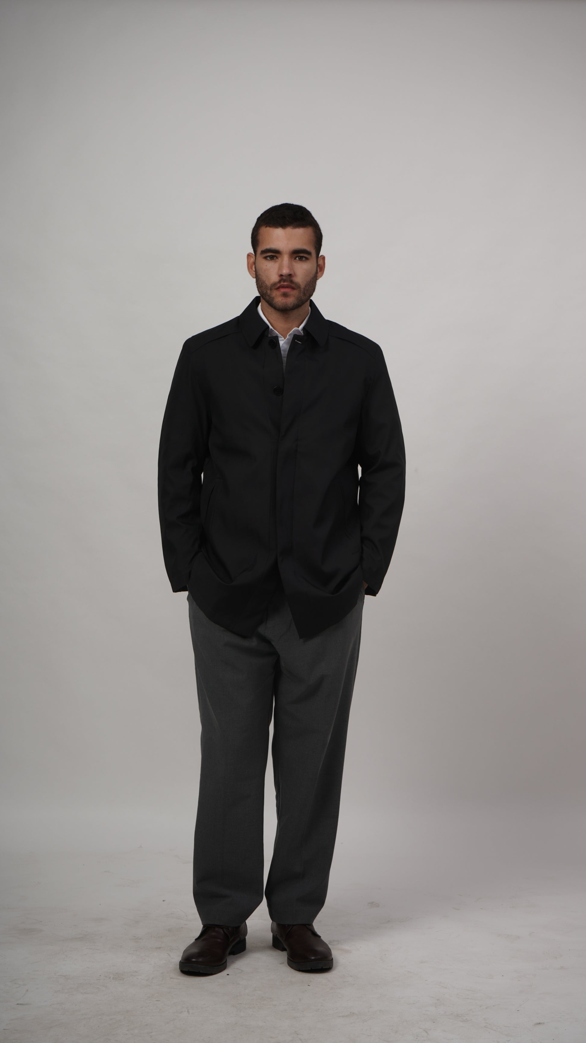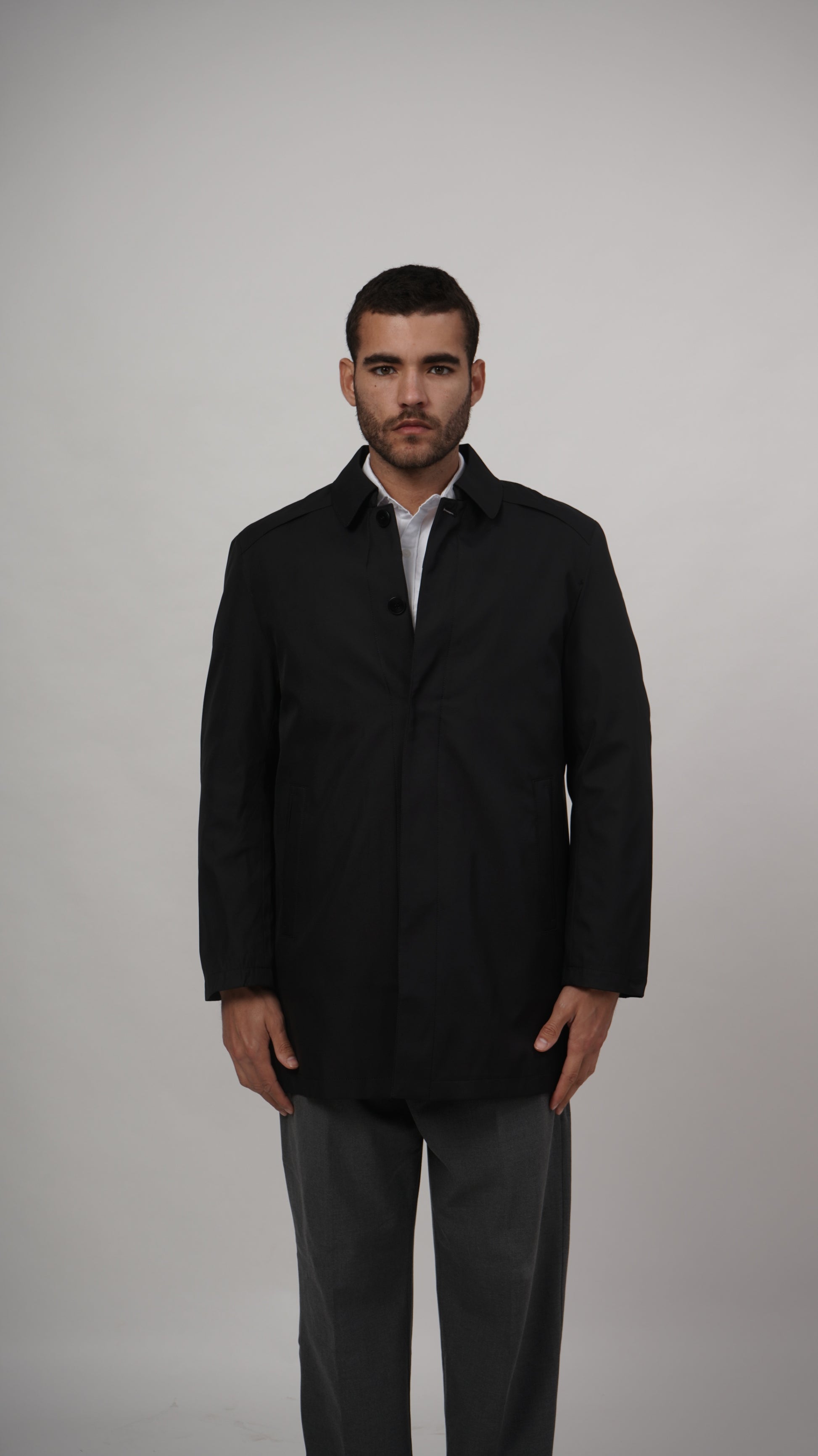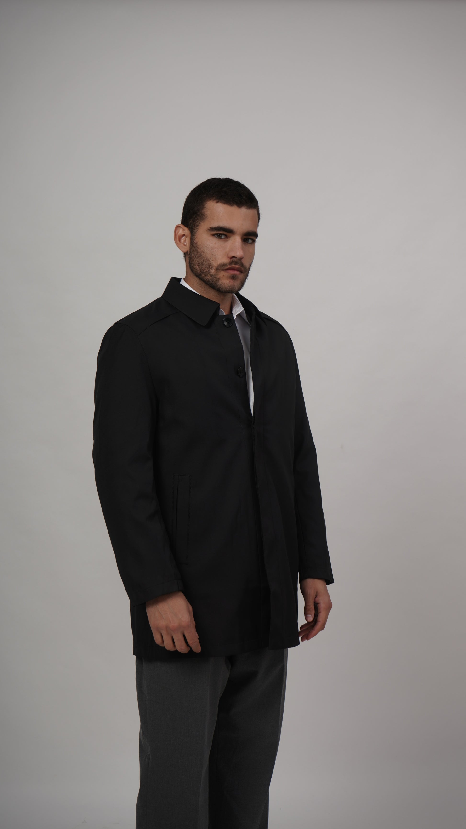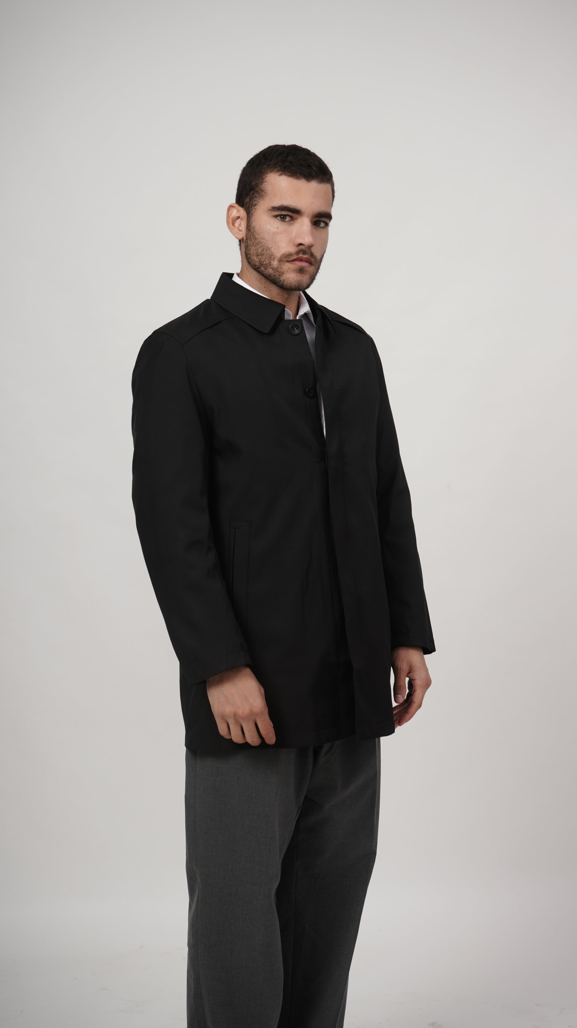 Command attention with this striking black short long coat. The premium polyester construction delivers durability and structure, while the contemporary silhouette creates a bold statement that bridges the gap between classic and modern styling.